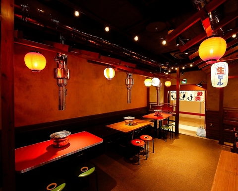 海浜幕張駅北口徒歩1分とアクセス良好!アウネ5階のカジュアルな焼肉店です。店内は赤ちょうちんの灯りを目当てに人々が集まってくる「横丁」をイメージ。レトロであたたかみのある雰囲気が漂っています。店内奥の広々としたフロアは30名様~37名様まで貸切OK!会社宴会や大人数でのお集まりにぜひ。