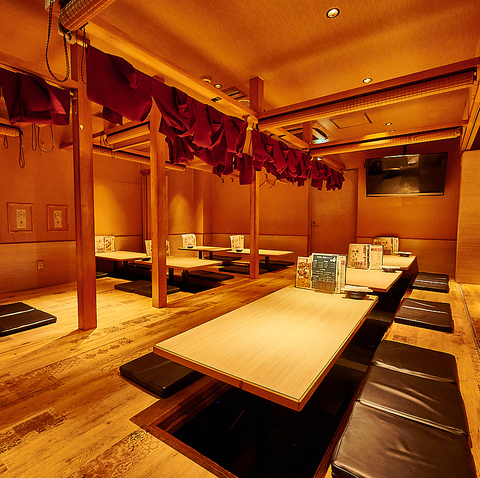 間接照明の効いた大人な雰囲気の広々としたゆったり個室は接待や会社同僚の宴会にぴったりです。暖かみのある照明が語らいと特別な空間を演出致します。少人数から大人数のお客様までプライベートな空間で楽しめます。テーブル席と掘りごたつ席、ロフトを開放すれば大空間となり、最大1組50名様までの宴会が可能です。