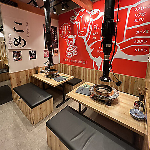 【広々とした空間あるテーブル席】2名様~、4名様~、6名様~と様々なプライベートシーンに最適なお席をご用意いたします。ご家族でのお食事、デート、お仕事帰りのサク飲みなど…出来立てホクホク近江米と肉汁溢れる近江牛をお愉しみ下さい♪
