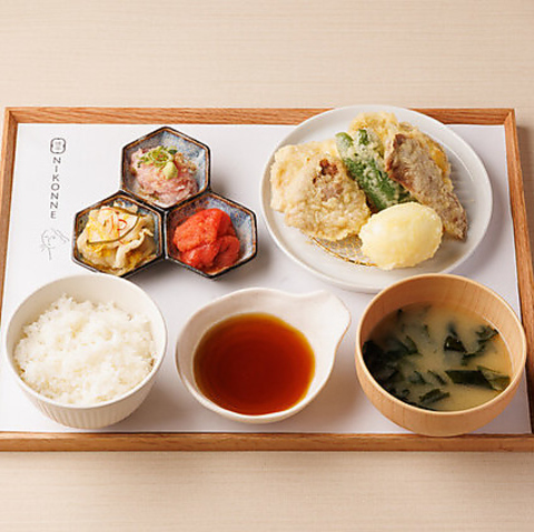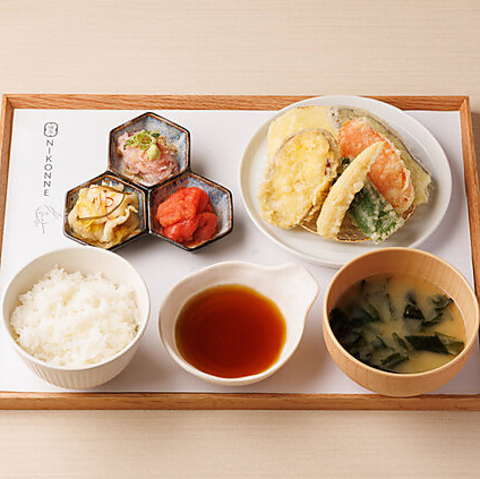 博多NIKONNEの天ぷらは、博多では定番の豚ロースをはじめ、季節の野菜、魚介など、多彩な素材の天ぷらをお楽しみいただけます。特製ブレンド小麦粉を使用した軽い衣と、植物性の高温の油で揚げることで、サクッとした軽い食感と黄金色の美しさを実現。博多の焼き塩やカレー塩で、さらに味わい深くご堪能ください。※写真は海鮮天ぷら定食