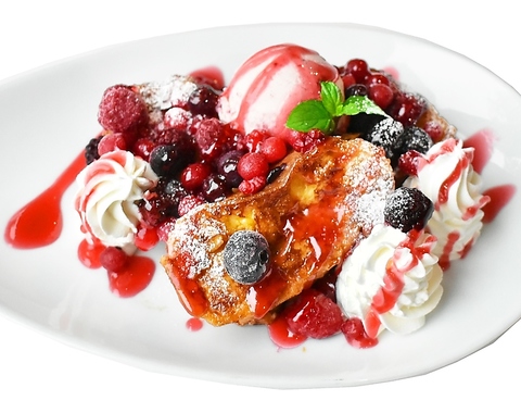 【カフェタイム限定】カフェタイム人気No1のフレンチトースト!ルーファスジャムソースとレアチーズもトッピングした贅沢なオリジナルメニューです。初めての方にまず召し上がっていただきたい、おすすめの一品となっています。他にもキャラメルナッツやベリー、チョコバナナなど見た目も華やかなフレンチトーストを各種ご用意しております♪
