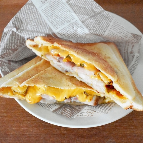 【14:30~のカフェタイムにも軽食のご用意がございます♪】ローストポークにマーマレードソースとピクルス、チーズでキューバサンド風に。