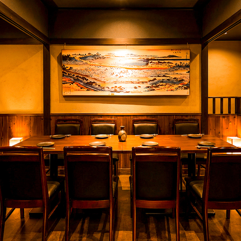 【和の趣に包まれた上質空間◎】少人数から団体様までご利用いただける完全個室を多数ご用意しております。接待・会食・記念日などに最適な4名様個室や、女子会やご友人との集まりにぴったりな5~6名様個室もございます。最大15名様まで対応可能な広めの個室では、社内の打ち上げやご宴会にも対応◎