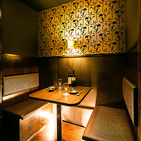 おしゃれな花柄クロスと間接照明が目を引く、レトロで可愛い2名様個室!ソファー席でゆったりくつろげるので、デートやサシ飲みのもピッタリ!落ち着きつつも華やかさのある、こだわりの個室空間です!