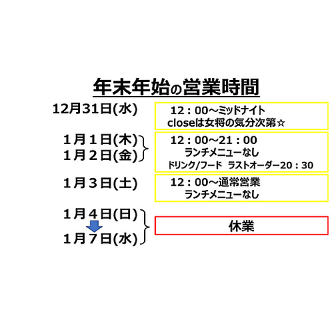 大晦日は、ミッドナイト!1月1日、2日は12時から、21時まで!1月3日は、12時から24時30分まで営業!