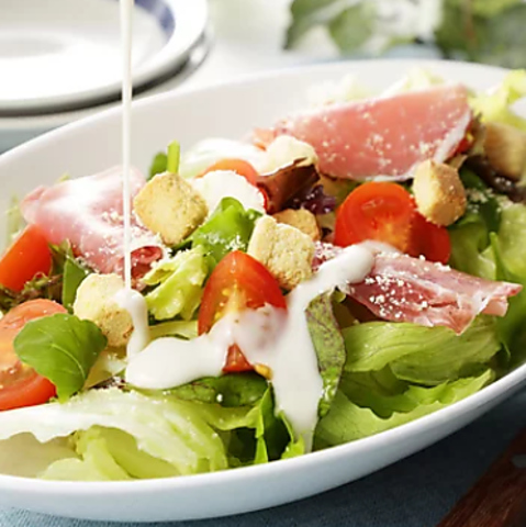 クルトンやパルメザンチーズをトッピングしたレタスなどの葉物中心のサラダ
