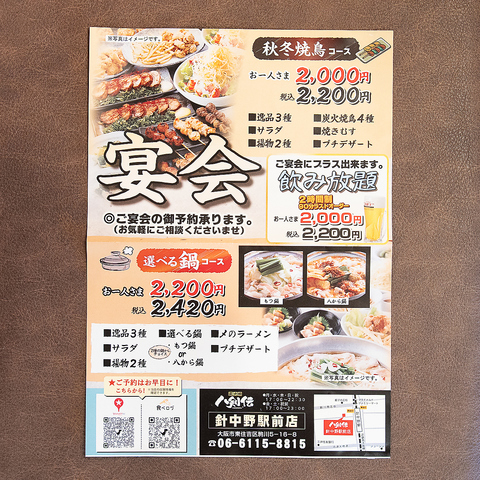 焼鳥コースとお鍋コースをご用意しております!気分に合わせてお選びください♪飲み放題の追加もできます◎