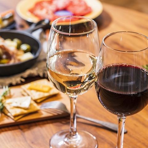 豊富なお酒の種類も当店の魅力の一つ!特に、ワイン1杯450円から手軽に味わえるのも好評です。手間暇かけた逸品と併せてゆっくりとお楽しみください