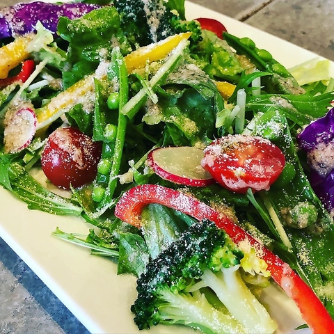 粗塩、人参、アンチョビの3種類からドレッシングを選べる、ボリューム満点のグリーンサラダが大好評♪色とりどりの野菜にドレッシングをかけ、新鮮野菜をたっぷりとお召し上がりいただけます!ご宴会時にはシェアして楽しんでも◎食べやすい「ハーフサイズ」は880円(税込)でご提供♪