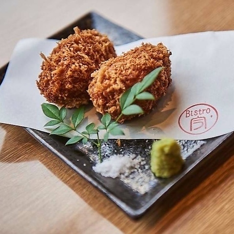 柔らかく、脂身がとろんとして甘みがある高級豚「黒豚」を贅沢に使用した「極上黒豚メンチカツ」は、ぜひ一度ご賞味いただきたい絶品メンチカツ!サクサクの衣と、ジューシーな黒豚の旨味が堪能できる、まさに極上の逸品です♪粗塩やわさびを添えてお楽しみください◎