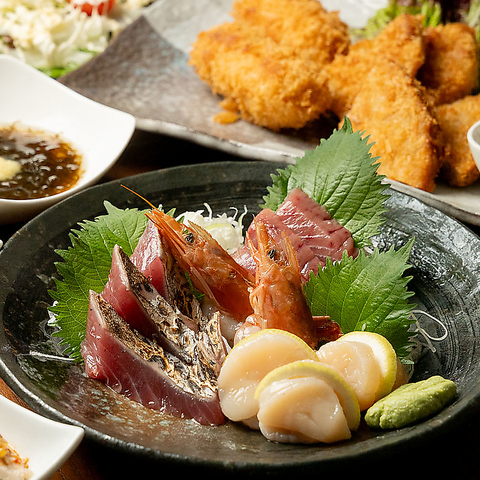 新鮮なお刺身の盛り合わせや前菜、揚げ物、こだわりの逸品など大満足な全5品。2時間飲み放題付きでコスパ◎です!なんと持ち込みもOKです♪お刺身盛り合わせが絶品と常連様から人気です♪10名様~最大20名様まで会社宴会や歓迎会・送迎会あらゆるシーンでご利用下さい♪