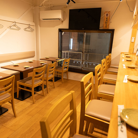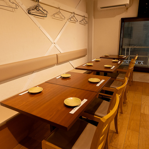 温かみのある木目調のテーブルと柔らかなクリーム色のソファが配された店内は、清潔感に溢れ、ゆったりとくつろげる空間です。壁には便利なハンガーも完備。少人数から大人数まで対応可能で、貸切利用も承っております。大切な方との会食や特別な集まりに、ぜひご利用ください。
