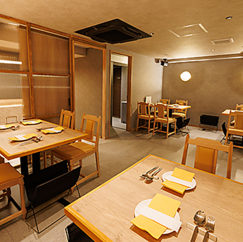 【木のぬくもり感じるテーブル席】明るい照明の下、広々とした心地よいテーブル席でリラックスした時間をお楽しみいただけます。友人や大切な人と共に、料理を囲んで素敵な会話をお楽しみください。デートや女子会にオススメ◎