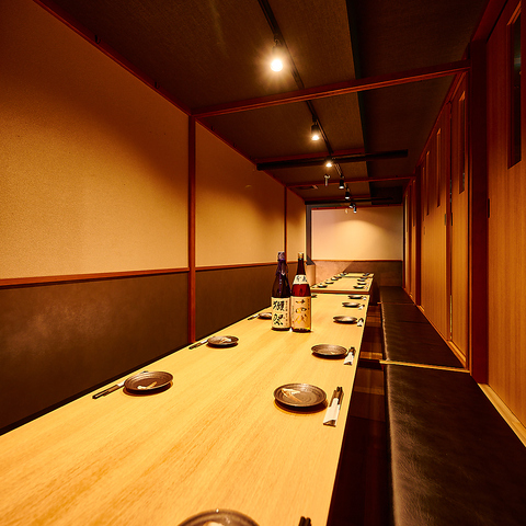 【半個室】温かみのある天然木の調度品と間接照明の設えが、落ち着いた雰囲気を演出する居心地のいい空間のカウンターをご用意しております。