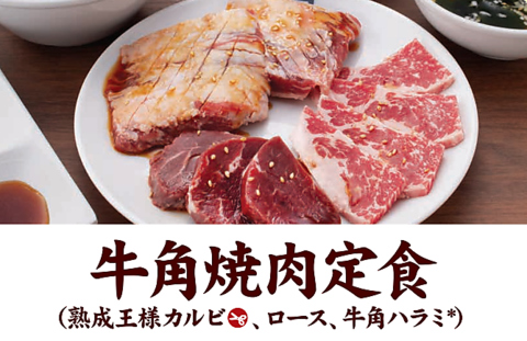 熟成王様カルビ、ロース、牛角ハラミ(サガリ)ごはん、わかめスープ、チョレギサラダ付き