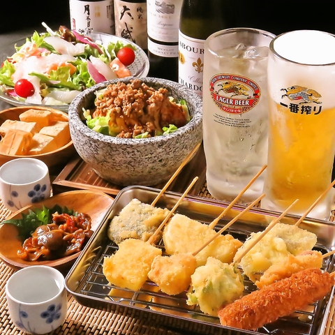 【串揚げ&串天ぷらが豊富】当店名物の串揚げ&串天ぷらをぜひご賞味ください!定番の豚やえび、ナスや玉ねぎ以外に、牡蠣やトマトなどの変わり種もご用意しております。ドリンクが進むこと間違いなしです!他にも刺身や揚げ物などの一品料理もございます♪