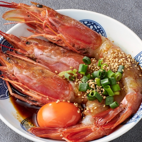 大赤海老×和たまご♪自家製ユッケだれに漬けた大きな赤海老に濃厚な和たまごが絡み合います。当店の「つまみユッケ」です。