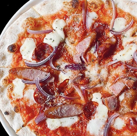 (ピリ辛サラミ、ソーセージ、赤タマネギ、オレガノ、トマトソース、ゾーナ産モッツァレラチーズ、ペコリーノチーズ)