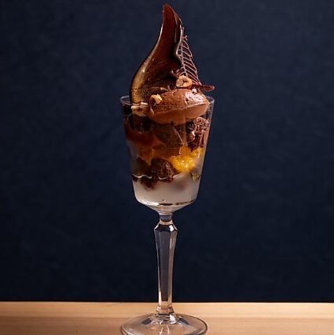 ―重なりの先にきらめく、黒の余韻―ショコラ×オレンジ×ヘーゼルナッツキャラメル、プラリネ、チョコレートアイスへから始まり、コアントロー香るジュレへと続く。夜に寄り添う濃密なショコラパフェ。その頂に添えられたショコラの羽は、勝利の女神ニケの翼を模して。※アルコール使用※ラフロイグ香るキャラメルソース付き