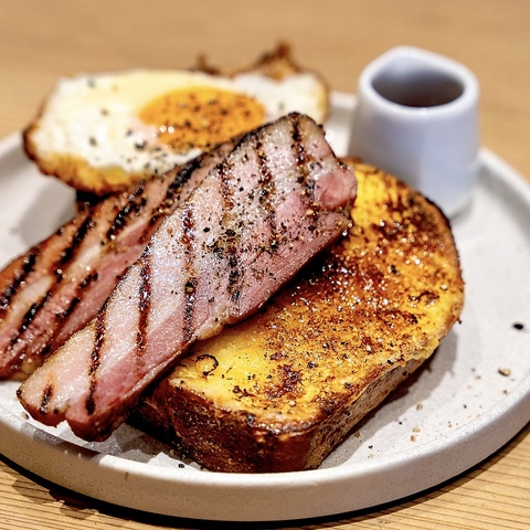 自家製ベーコンと目玉焼きの甘じょっぱの組み合わせ