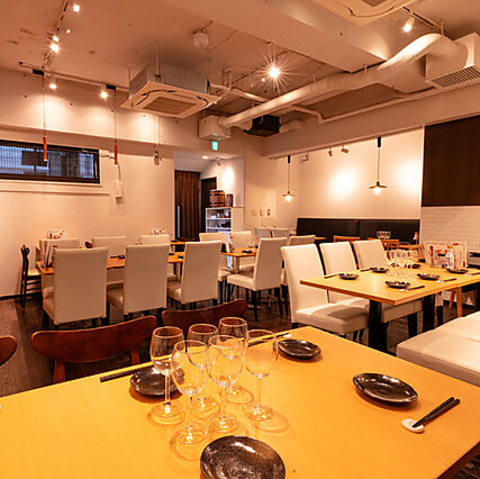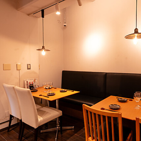 お洒落で落ち着いたテーブル席で、ゆったりとお食事をお楽しみいただけます。白を基調とした明るい内観で、壁一面には樽ワインが並ぶフォトジェニックな空間ですな◎片側がソファーになっているお席もございますので、友人との飲み会や宴会の他、デートや記念日などでのご利用にもぴったり。