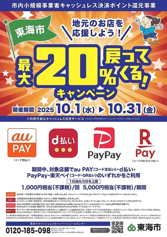 東海市キャッシュレスキャンペーン対象店舗!お会計に4つのQR決済ご利用でポイントバックのキャンペーンやっております!10月31日までのご予約でお使いいただけますので詳細はお店か東海市HPをご覧ください。