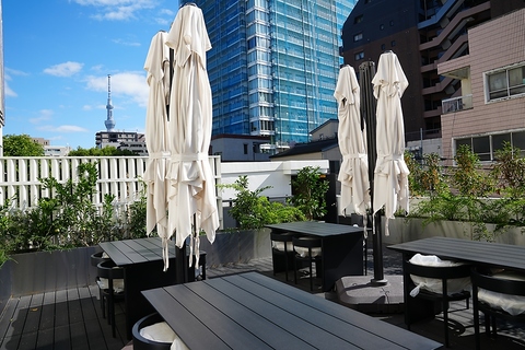 スカイツリーを望む屋上のガーデン席は、カジュアルな集まりに最適です。黒を基調としたテーブルと白い座面のソファ席は高級感がございます。また、周囲を囲う植物と明るい色味の照明が上品な雰囲気です。パラソルもご用意しておりますので、日差しの強い季節も快適にお過ごしいただけます。