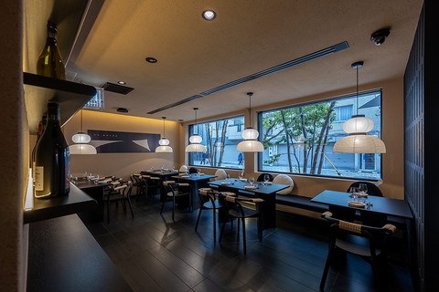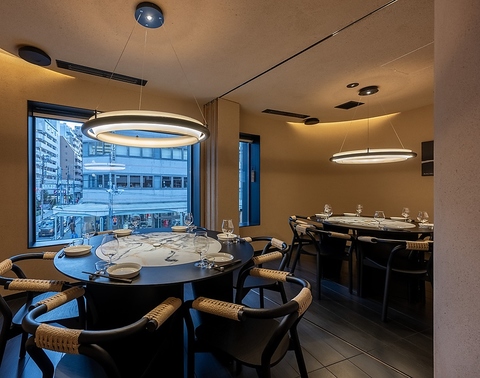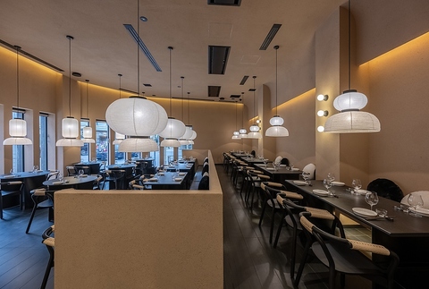 高さ5メートルの天井は広々としており、照明も明るく上品な雰囲気となっております。ご友人との会食やご家族とのお食事など、様々なシーンに最適です。店内の内装にもこだわっており、椅子はデンマークのブランド、そして日本人デザイナーの黒田達郎氏の作品です。