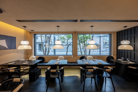 高さ5メートルの天井は広々としており、照明も明るく上品な雰囲気となっております。ご友人との会食やご家族とのお食事など、様々なシーンに最適です。店内の内装にもこだわっており、椅子はデンマークのブランド、そして日本人デザイナーの黒田達郎氏の作品です。