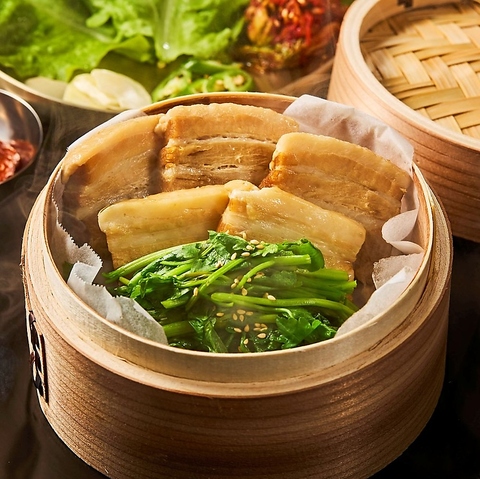 マッコリとテンジャン(韓国味噌)に漬け込み、甘みとまろやかさがUPした熟成国産豚肉はキムチやねぎ、ニンニクと一緒にえごまの葉で包んで食べるとお酒が進みます!他にも本場韓国でも人気のミナリ(セリ)やチュクミ(イイダコ)を加えたものもございます。会社宴会はもちろん、ご友人同士の飲み会にもぜひご利用ください!