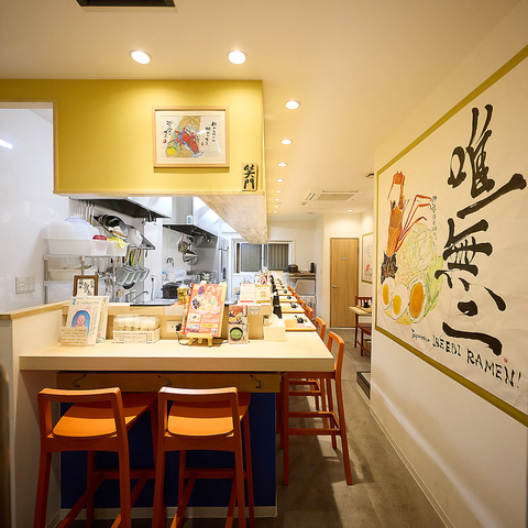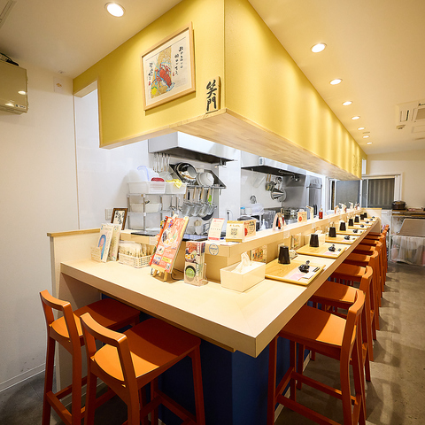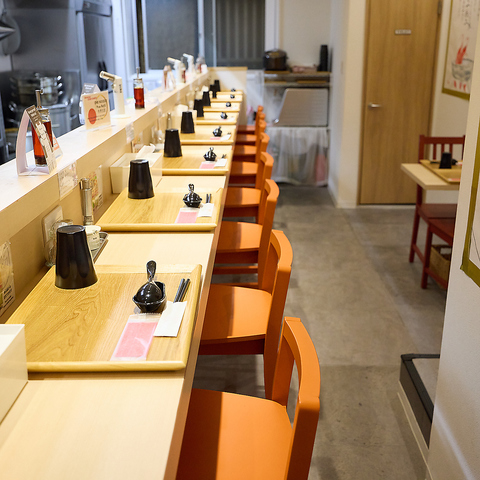 従来のラーメン店のイメージを覆す、カフェのようなスタイリッシュな内装。赤・青・黄のビビッドな配色は海と太陽をイメージしており、写真映えも抜群です。清潔感あふれる店内は、女性お一人様でも気兼ねなく入店できる開放的な雰囲気が魅力です。。