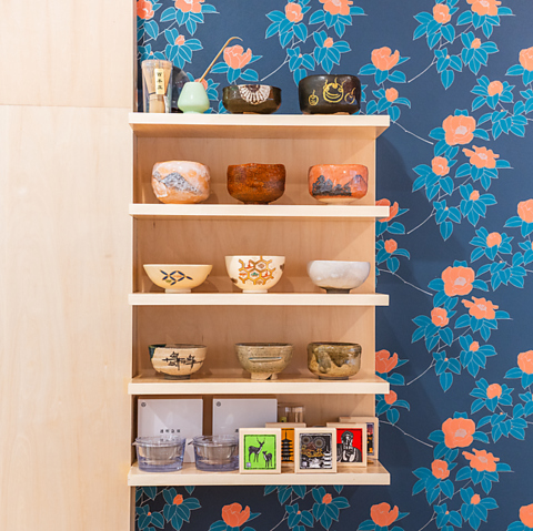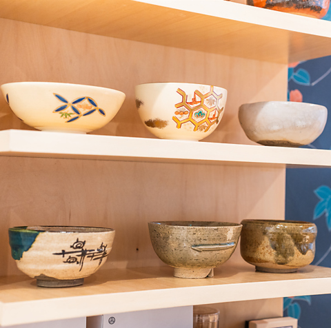 ずらり並んだ茶碗から一つをセレクト。器が変わると味わいも気分も変わる、抹茶点ての楽しみ。ぜひどうぞ♪