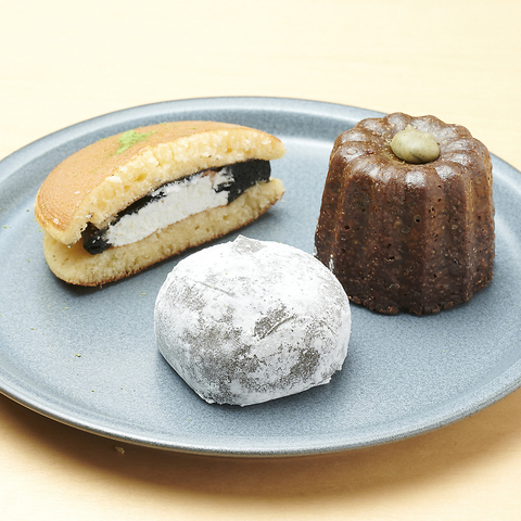 ワンプレートは、どら焼き・ごま大福・カヌレの三種盛り。ふわっと香る生地、ぷちぷち胡麻のコク、外カリ中しっとりの食感差が楽しい一皿です。。温かいお茶にも、ミルク感のあるドリンクにも相性◎。一皿で和と洋を行き来できるので、デザートを迷いたくない日にぴったり。おすすめ。