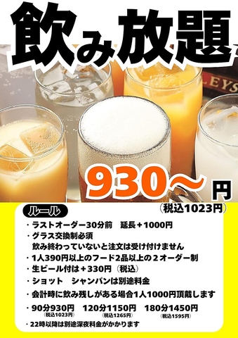 | 飲み放題 | あり :【当日OK予約なしOK】単品飲み放題2時間1100円/3時間1500円/エンドレス2200円(+350円で生ビール付に変更可) |