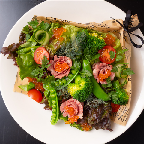 和牛の旨みを最大限に引き出したローストビーフを、花束のように美しく仕立てたブーケサラダ。しっとり柔らかな和牛に、彩り豊かな旬野菜と爽やかなハーブを合わせ、見た目にも味わいにも華やかさを演出しました。特別な日のおもてなしや記念日の一皿として、上品に彩る贅沢なサラダです。