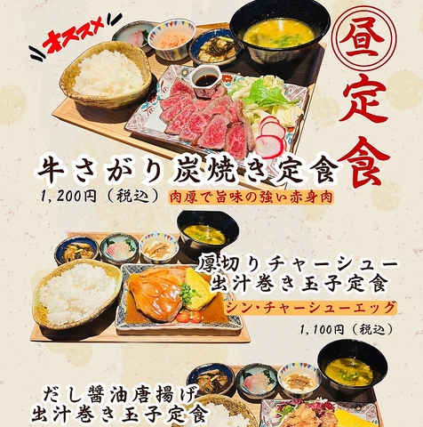 脂身と赤身のバランスが絶妙な牛さがりを炭火で焼くことで、肉の旨味を逃さず外は香ばしく中はジューシーに仕上げたオススメの定食です。/【厚切りチャーシュー出汁巻き玉子定食】1100円(税込)などほかの定食・丼・カレーもございます。/定食はご飯の量選べます!(少なめ150g/普通200g/中盛り250g/大盛り300g/特盛り400g)