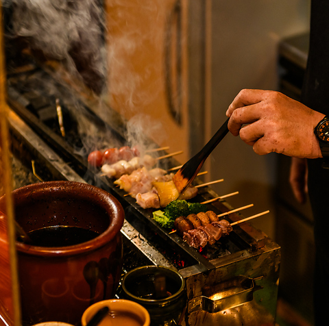 国産鶏を使用した焼鳥をその場で調理!新鮮な国産鶏を使用した当店の焼き鳥は、ジューシーで柔らかく、鶏の旨みがぎゅっと詰まった逸品です。独自の焼き加減で焼き上げた焼き鳥は絶妙な味わいで、一度食べるとやみつきになること間違いなし!
