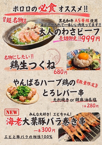 迷った方はまずポロロの三大名物から◎大人のわさビーフ、鶏生つくね、やんばるハーブ鶏のとろレバー串、海老大葉豚バラ巻き串!ぜひ一度ご賞味ください!その他アラカルトメニューも豊富にご用意しております!