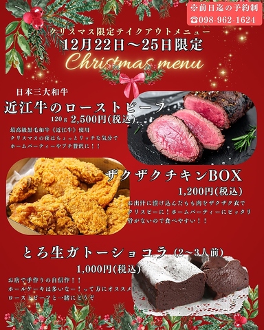 日本三大和牛 近江牛のローストビーフ 120g 2,500円(税込)/ザクザクチキンBOX1,200円(税込)/とろ生ガトーショコラ (2~3人前)1,000円(税込)
