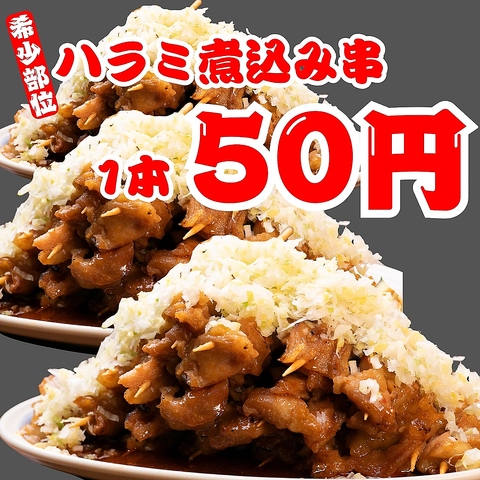 金目樽名物ハラミ煮込み串1本50円!鶏ハラミを旨辛味噌だれで煮込みました!