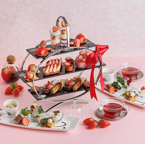 【アフタヌーンティー】華やかなアフタヌーンティーを楽しめるホテルのラウンジ。開放感のあるテーブルスペースは70席あり、大きな窓も相まって広々とした気分で過ごせます。アフタヌーンティーは飲み放題付き。90分間、ドリンクメニューの中からお好きなドリンクをお楽しみいただけます。
