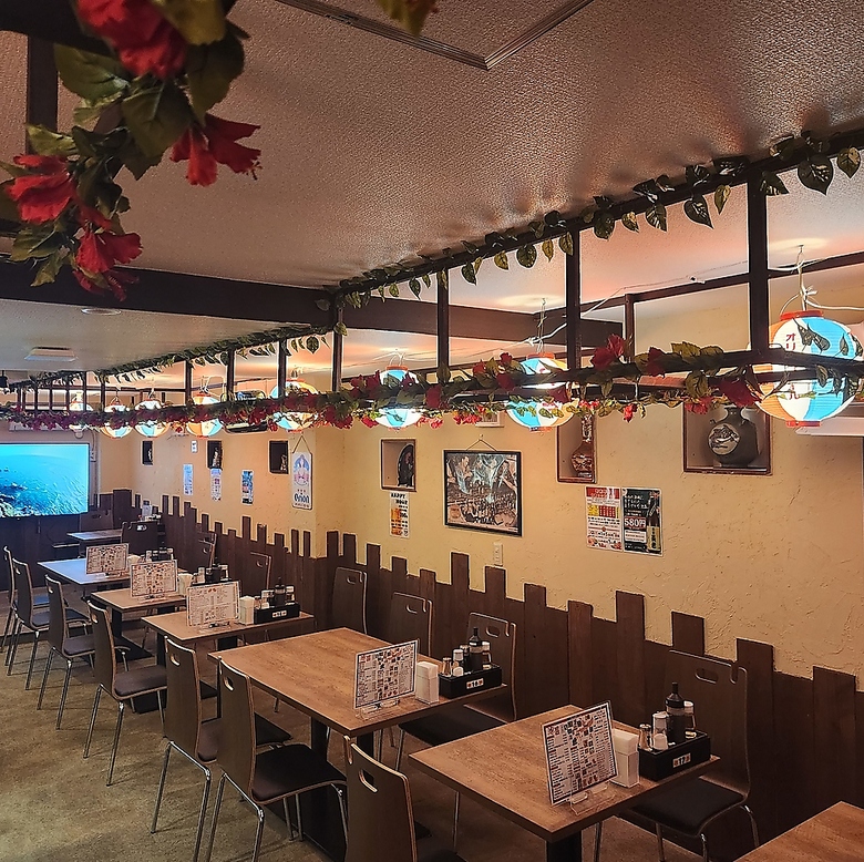 【明るく広々!心地よい癒しの空間】店内は白を基調とした明るく広々とした空間。木目調のアクセントと柔らかな照明が温かみを演出し、リラックスできる雰囲気です。お一人様からご家族、グループでの集まりまで快適にお過ごしいただけます。特別なひとときを彩る上質な空間で、沖縄料理をぜひお楽しみください!