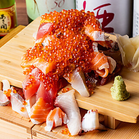 当店名物「海鮮こぼれ盛り」は、厳選した新鮮な海の幸を贅沢に盛り付けた圧巻の逸品。豪快に溢れ出すイクラや旬魚のお刺身は、見た目の迫力も味わいも抜群!職人がその日の仕入れで厳選した素材を使用し、鮮度と旨味にこだわりました。豪華な見た目と贅沢な味わいを一度に楽しめる、自慢の一皿です。【1,550円】