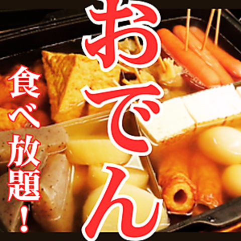 旨みたっぷりのお出汁が染み込んだ、当店自慢の人気おでんが食べ放題!大根、玉子、ちくわなど、ほっと心温まる定番の味わいを、思う存分ご堪能いただけます。定番からしなどと一緒に食べればさらに素材の味を引き立てます!さらに、豊富なドリンクメニューも飲み放題!お腹いっぱい、心ゆくまでお楽しみください!