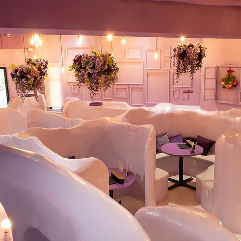 雪国を思わせるかまくらのお席と紫基調の空間で、幻想的なカフェ体験を。