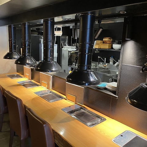 【おしゃれなカウンター席】おひとり様でも気軽に焼肉を楽しめるカウンター席を完備しています。仕事帰りの一杯や、友達と一緒に横並びで座るデートにもぴったり♪リラックスして食事ができる空間です。焼肉の香りに包まれながら、贅沢なひとときを過ごせること間違いなし!