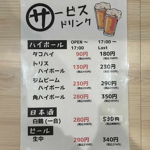 毎日OPEN~17時までドリンクがお得!!ビールやハイボールなど対象メニューを割引価格でご提供いたします◎