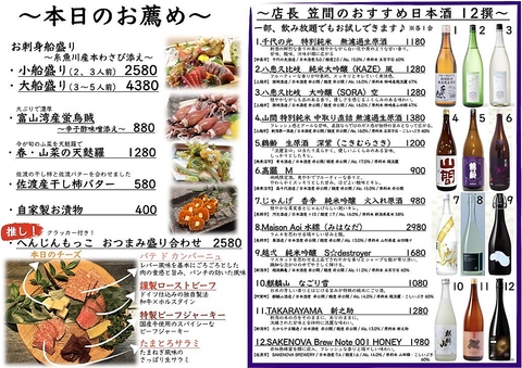 当店自慢の新潟地酒50種に合わせた料理を取り揃えております。気になるお酒がありましたら、スタッフにお尋ねください。