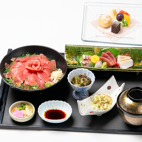 小鉢 二種/御造り三種盛り/鮪漬け丼/味噌汁/香の物/デザート