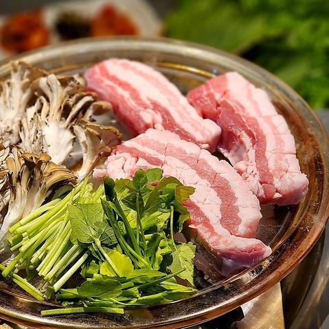 香川のブランド豚、オリーブ豚の三段バラを使用。野菜やエゴマの葉、キムチなどを巻いて食べる一品!!